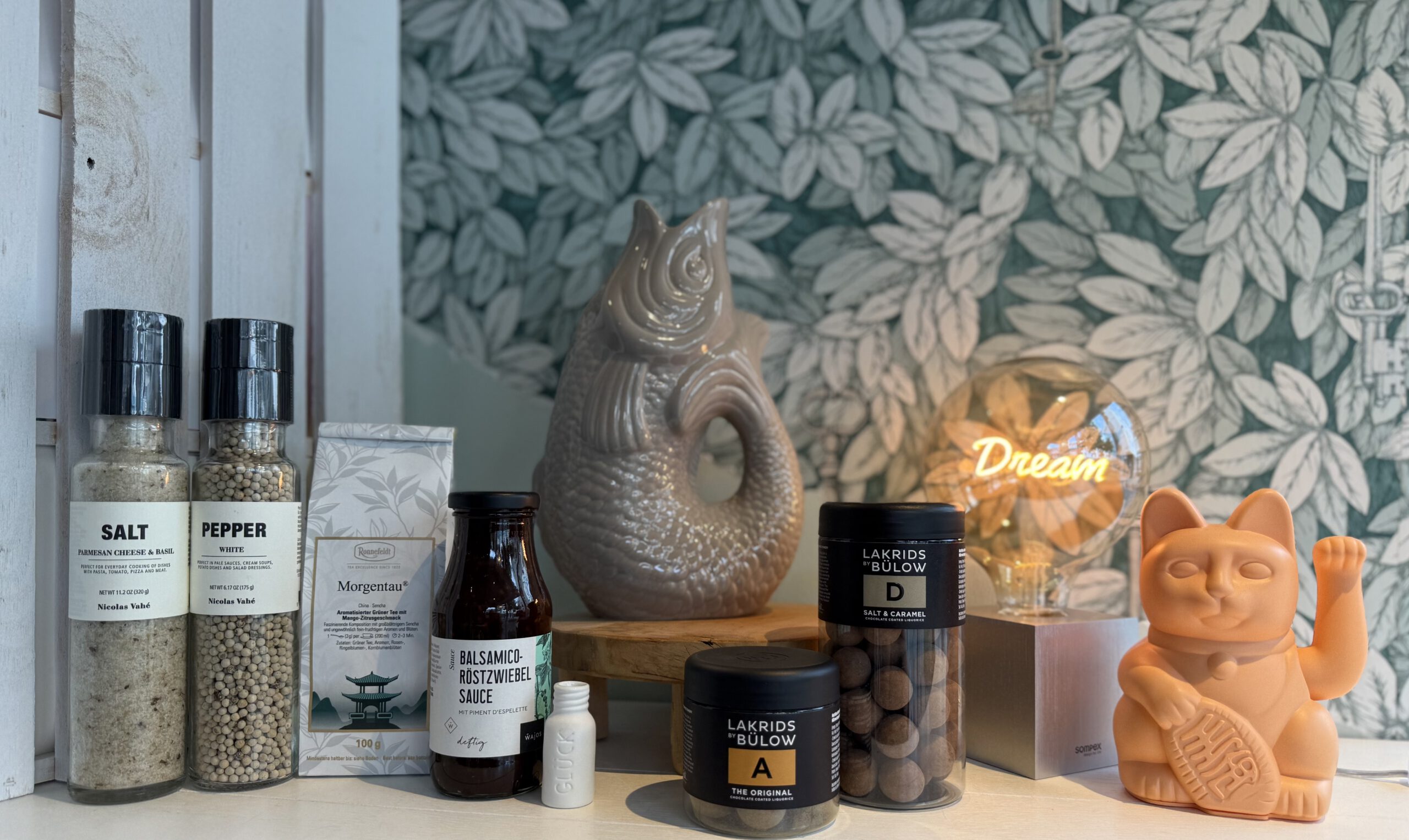 Sie finden bei uns neben vielen, vielen anderen Artikeln Schönes aus der Design-Welt von Gift Company, Praktisches in tollem Design von Remember, die bunten Manekineko Winkekatzen von Donkey, Geschirr und Taschen von Pip-Studio, zauberhafte Glücksbringer, Dekoartikel und Karten von Good Old Friends, hochwertige Kissen von pad, Einkaufsbeutel von Loqi, To-go Becher und Lunch-Boxen von ChicMic, Tassen und Servietten von PPD, Lampen von Sompex und sehr zur Freude unserer jungen Kundinnen die tollen Haar- bzw Armbänder von KKNEKKI.